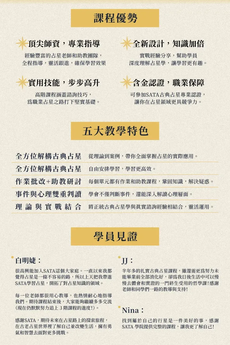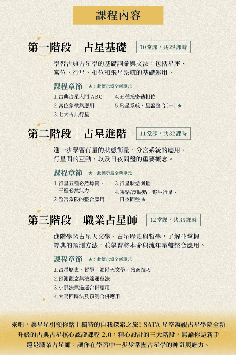 SATA 占星學院的課程設計,讓你從「基礎認識」到「專業應用」循序漸進: